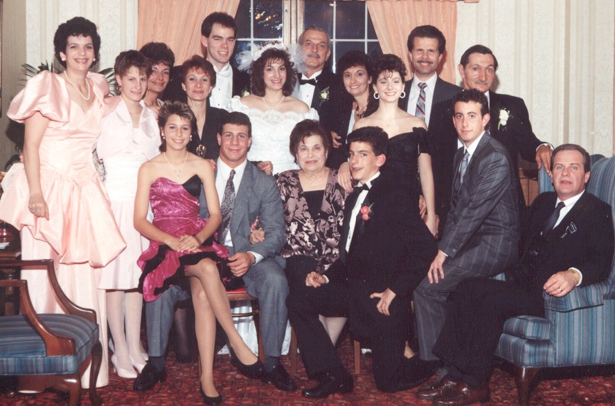 Standing are: Laura Marie Essegian (Niece, born 12 Feb 1967, age 22), Nicole Maria Terranova (Niece, born 2 Jul 1974, age 14), Blanche (Masillo) Essegian (Sister, born 14 Sep 1943, age 45), Maria Immaculate (Masillo) Essegian (Sister, born 8 Dec 1945, age 43), the groom William (Jr) O'Bryan (born 16 Jun 1964, age 24), the bride Lisa Ann (Essegian) O'Bryan (Niece, born 2 Dec 1964, age 24), Richard Essegian (born 2 Sep 1941, age 47), Tecla (Masillo) Nicklas (Self, born 29 Jul 1949, age 39), Deborah Anne Nicklas (Daughter, born 21 Feb 1973, age 16), Raymond Nicklas (Self, born 12 Apr 1947, age 42), and Vito Masillo (Brother, born 25 Jan 1940, age 49).